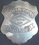 (c) a shield-shaped badge with "Railroad" at the top, "Police" at