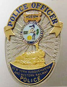 Our special thanks to Tony Carp for providing these images and information Comment received Spring, 2016: "The NY&SWRR Badge [shown above is a replica of ] a badge I received back in the 1980s. It was NYS&W Badge #1. I also received credentials for said railroad and was on call for railroad problems in our area. I was a cop for the local dept. I had powers of arrest. Funny to see that badge as a fake today! I sold that badge after I retired." [Thanks to JS] |
