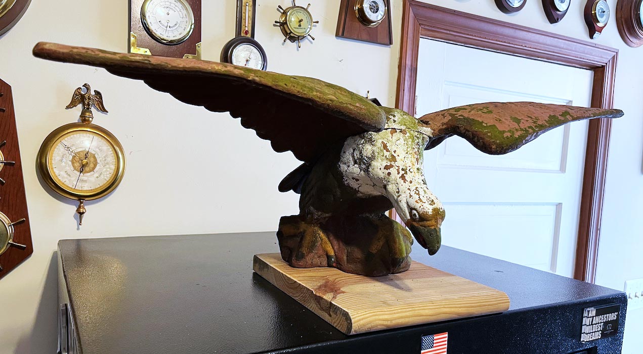 As a form of entertainment Nancy and I have been going to flea markets, estate sales, and various antique venues like shops, shows and auctions for many years. Recently we attended a large antiques flea market where Nancy spotted it first! The mismarked tag read: "Cast Iron Architectural Eagle circa 1910". I examined the heavy two-piece, cast iron eagle with a wingspan of about 32 inches. It was covered in old paint which may or may not have been original. I knew immediately it was coming home with us! After very little negotiating on my part, and much encouragement on Nancy's, a long sought-after "engine eagle" was loaded into the back of our car. Nancy named him "Sam" (after Uncle Sam), and we decided to leave him in "as found condition".