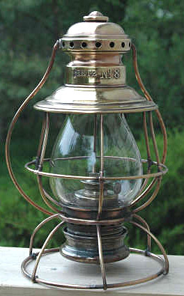Conductors LanternsConductors lanterns, sometimes called "presentation lanterns", are the most ornate and stylish of the various railroad lantern styles. As the name implies, these were typically used by passenger train conductors who required a lantern that was suitable to being seen by the traveling public and that adequately represented the status of the conductor as the top-ranking official on board the train. Unlike airplanes where the pilot is both operator and boss, the conductor's authority on a train supersedes that of the engineer. Conductors lanterns were typically constructed in a better, more craftsman-like fashion than other types of railroad lanterns. The metal was typically brass or nickel plate which could be polished to a high luster, and the frame contours were more pronounced and ornamental. The base was typically (though not always) a bell-bottom style and the bail connected to the frame at a higher level than ordinary brakeman lanterns. The globes in conductors lanterns were usually a special size, smaller than globes in "tall globe" brakeman lanterns but larger than globes in "short globe" lanterns. It was (and is) unusual to find railroad initials on globes in conductors lanterns, but sometimes very ornate lettering indicating the owner of the lantern would be cut or etched into the glass. The name "presentation lantern" has been applied to this general style because such lanterns were sometimes given to employees upon retirement or other special occasions. Because of the beautiful and striking appearance of conductors lanterns, they are regarded as especially collectible (A.K.A. high-priced). A highly polished example can be the star of a collection, and a conductors lantern with a two-color globe is considered by most lantern collectors as the "holy grail" of the hobby. Many of the railroad lantern manufacturers made conductors lanterns, and some small companies more or less specialized in them. Shown below are examples made by different companies. Also see a separate page for a most extraordinary example. |