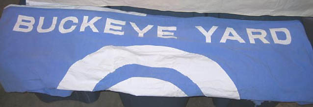 | Above left to right. The opening gate; ashtray stands from railroad passenger cars; a banner from Conrail's Buckeye Yard; a display board marked for the Brotherhood of Locomotive Engineers. |
