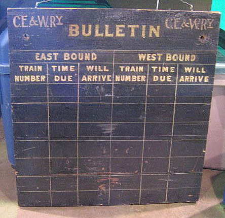 | Above left to right. A builders plate from the Juniata Works for a Pennsylvania Railroad K4s steam locomotive; a diesel builders plate from the Lima-Hamilton Corporation; a train bulletin board from the CE&W Railway; a bowl in the "Cleveland" pattern of the New York, Chicago & St. Louis, A.K.A. the "Nickel Plate Road". |