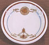 | Above left to right. A display of china, most in the "Mimbreno" pattern of the Atchison, Topeka & Santa Fe Railway; a butter pat in the "Fort Worth" pattern of the Colorado & Southern Railway; a Northern Pacific Railway chocolate pot (minus lid); and a plate in the "Centenary" pattern of the Baltimore & Ohio Railroad. |