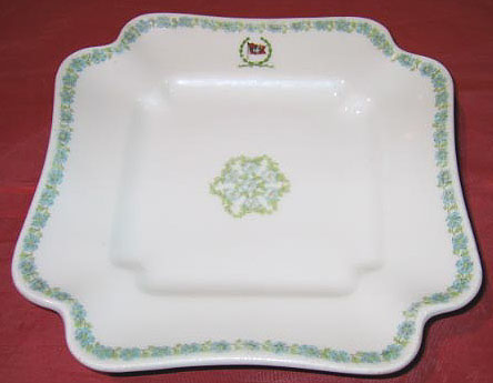 | Above left to right. A rare plate in the "St. Paul" pattern of the Chicago, Milwaukee & St. Paul Railway; a platter in the "Monon" pattern of the Chicago, Indianapolis & Louisville Railroad; a square platter in the "Batavia" pattern of the Lehigh Valley Railroad; and a bowl in the "Wabash" pattern of the Wabash Railroad. |