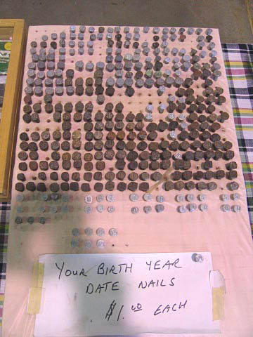 | Above left to right. Date nails; a lantern from the Coal & Coke Railway; a lantern from the Carolina, Clinchfield & Ohio Railway; a brass-top lantern with red cast globe from the Cincinnati, Hamilton & Dayton Railroad. |