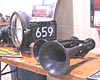 | Above left to right. Metal signs from the Seaboard Coast Line, Norfolk & Western and "Rock Island"; locomotive headlight with number board, horn and locomotive headlight with number board; and various railroad keys -- showing front and back (although there is suspicion that the "Vgn" (Virginian Railway) keys are fake since legitimate Virginian keys used the initials "Ry", not "Rwy". |