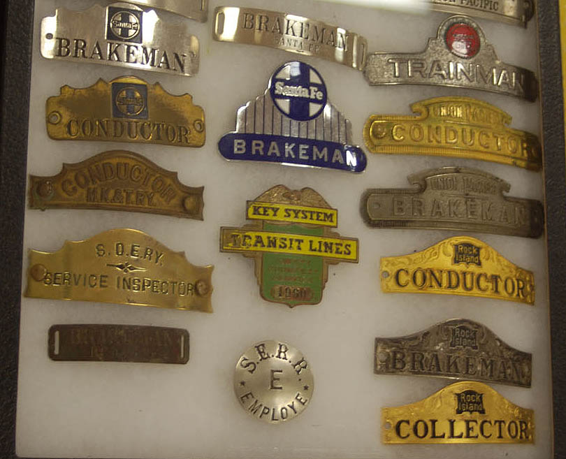 Above left to right. Two displays of locks, mostly brass; boxes of railroad-marked matches; a Baldwin Locomotive Works steam locomotive builder's plate.