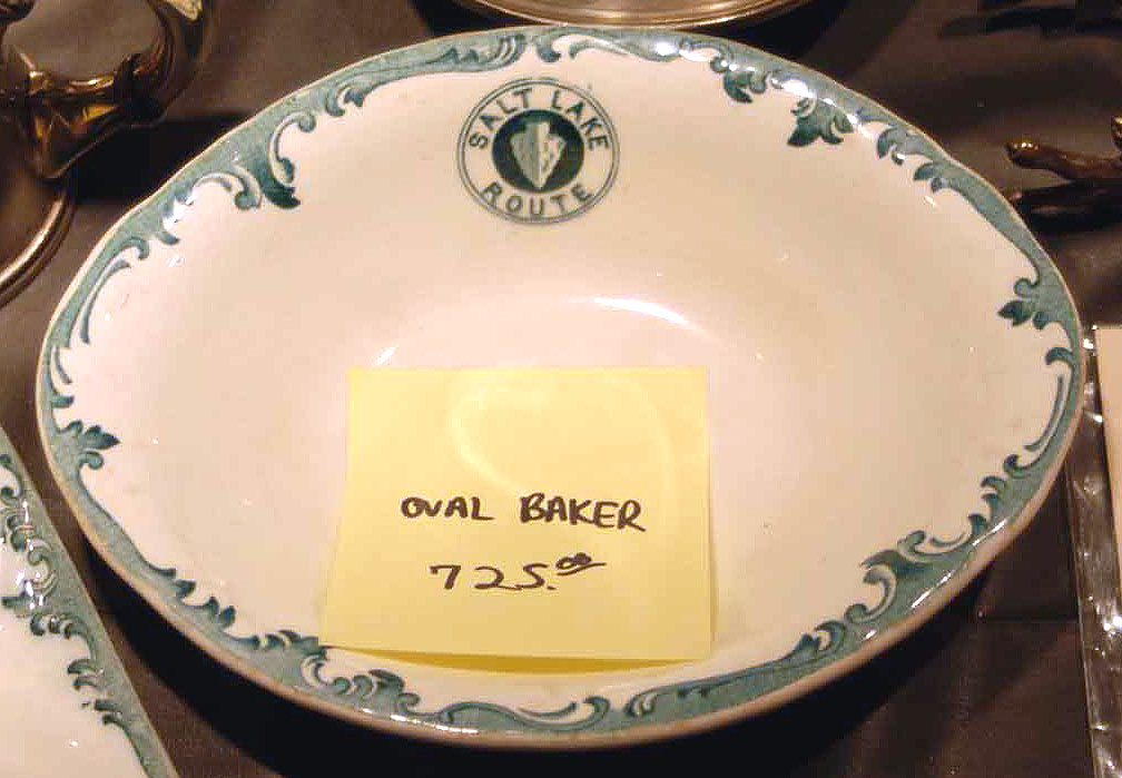 Above left to right. A platter in the "Stanford" pattern of the Southern Pacific; a small plate in the "Purple Laurel" pattern of the Pennsylvania Railroad; various china pieces in "Harriman Blue" pattern of the Salt lake Route; a small silver pot marked for the Salt lake Route.