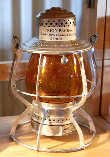 Above left to right. A silver syrup pitcher marked for the Southern Pacific; an Adams & Westlake bellbottom lantern marked for the Santa Fe (Atchison, Topeka & Santa Fe Railway) with a red cast logo globe; an Adams & Westlake bellbottom lantern marked for the San Pedro, Los Angeles & Salt Lake Railroad with a red cast "SLR" (Salt Lake Route) globe; an Adams & Westlake "Reliable" lantern marked for the Southern Pacific with a clear cast globe.