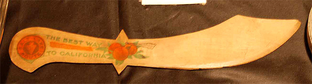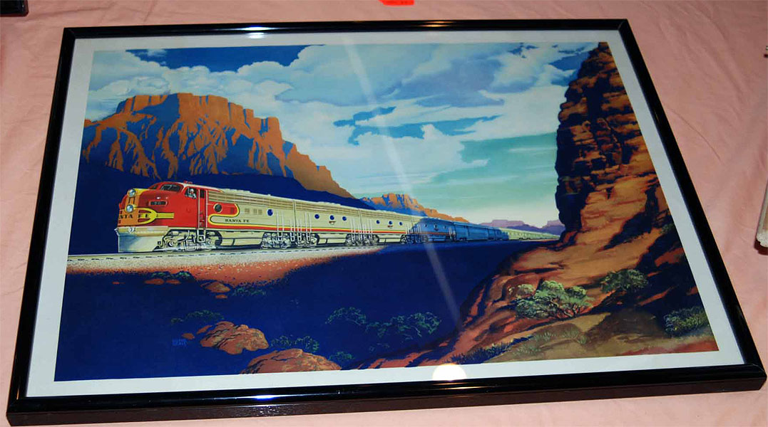 Above left to right. A display of mostly keys with a few locks; two promotional pictures issued by the Atchison, Topeka & Santa Fe Railway; a wax sealer from an unknown railroad.