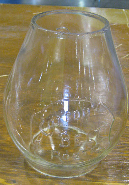 Above left to right. A Star Headlight & Lantern bellbottom lantern from the Boston & Albany with a clear cast globe; a Railroad Signal Light & Lantern bellbottom lantern with a clear etched globe from the Cumberland Valley; an A&W bellbottom lantern with a blue-etched globe from the Lake Erie & Western; a Steam Gauge bellbottom lantern with a clear etched globe from the Ohio River Railroad.