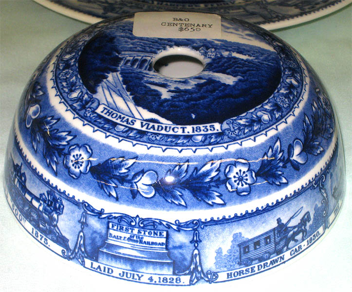 Above Left to Right. A cup and saucer set in the "Starucca" pattern of the Erie Railroad; a compote in the pattern of the Deer Park Hotel owned by the Baltimore & Ohio Railroad; a food cover in the "Centenary" pattern of the Baltimore & Ohio Railroad; a food cover in the "Cape Charles" pattern of the New York, Philadelphia & Norfolk.