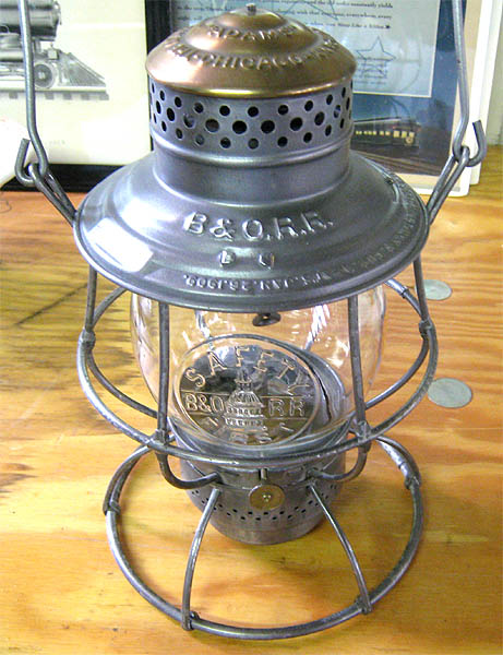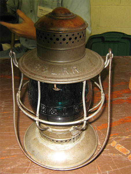 Above Left to Right. Adams & Westlake brasstop bellbottom lantern marked for the Baltimore & Ohio Railroad with a clear cast globe; Armspear or RRSL&L (probably) lantern with a green cast globe, railroad marking unknown but with "22544" stamped on the smoke dome; bellbottom lantern marked for the Boston & Lowell with a green cast globe; brasstop bellbottom lantern marked for the Maine Central with a clear cast globe; brasstop bellbottom lantern marked for the Central Vermont with a clear cast globe
