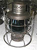 Above Left to Right. Adams & Westlake bellbottom lantern marked for (probably) the Allegheny Valley with a clear globe; Adams & Westlake bellbottom lantern marked for the "Frisco" with a blue globe; Adams & Westlake bellbottom lantern marked for the Lake Erie & Western with a blue etched globe; Steam Gauge bellbottom lantern marked for the Lackawanna & Wyoming Valley with clear cast globe; brasstop bellbottom lantern marked for the Northern Central with a clear etched globe.