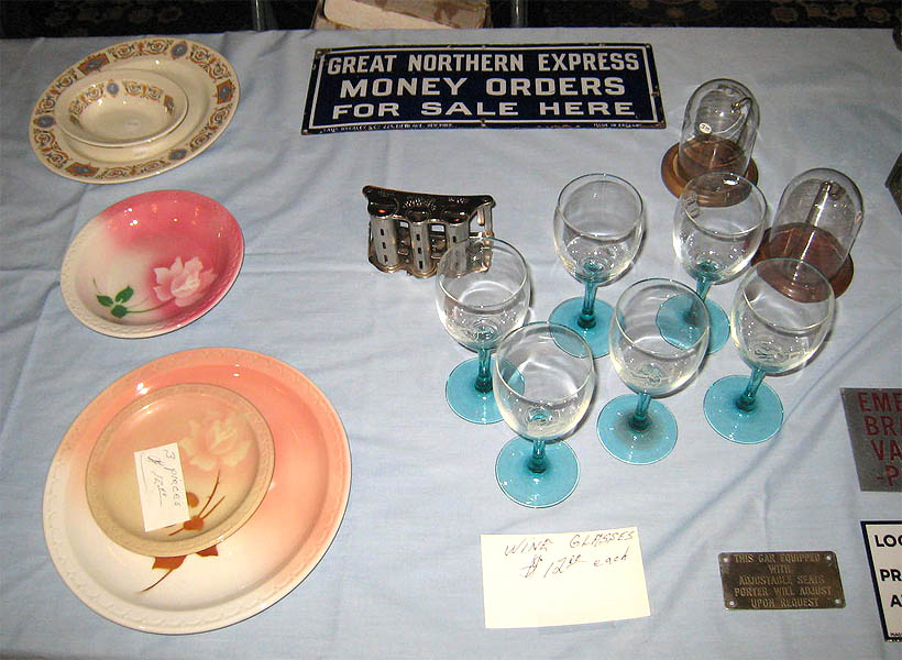 | Above left to right. A table of hardware; a baggage tag from the Wisconsin Central for a bicycle; steam locomotive builder's plate from the Baldwin Locomotive Works, a table of china mostly from the Great Northern. |