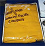 | Above left to right. A commemorative blanket form the Southern Pacific; an ALCO steam locomotive builder's plate; a display of railroad china; a children's dinner plate used by the Union Pacific. |