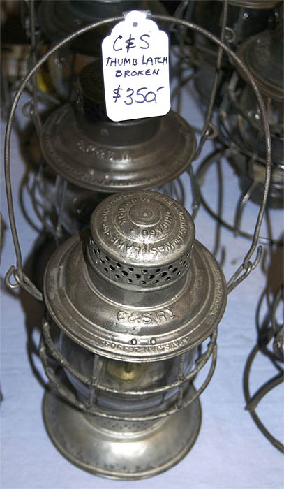 | Above left to right. A lantern with a clear cast globe from the Union Pacific; a display of lanterns; a display of locks; a whistle. |